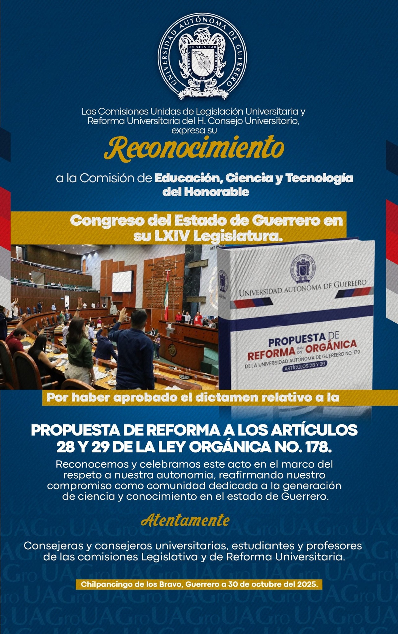 Chilpancingo, Gro., 31 de octubre de 2025.– En un hecho histórico para la UAGro, el pasado 9 de septiembre el H. Consejo Universitario aprobó por unanimidad la propuesta de Reforma Universitaria a la Ley Orgánica No. 178, específicamente en sus artículos 28 y 29.
