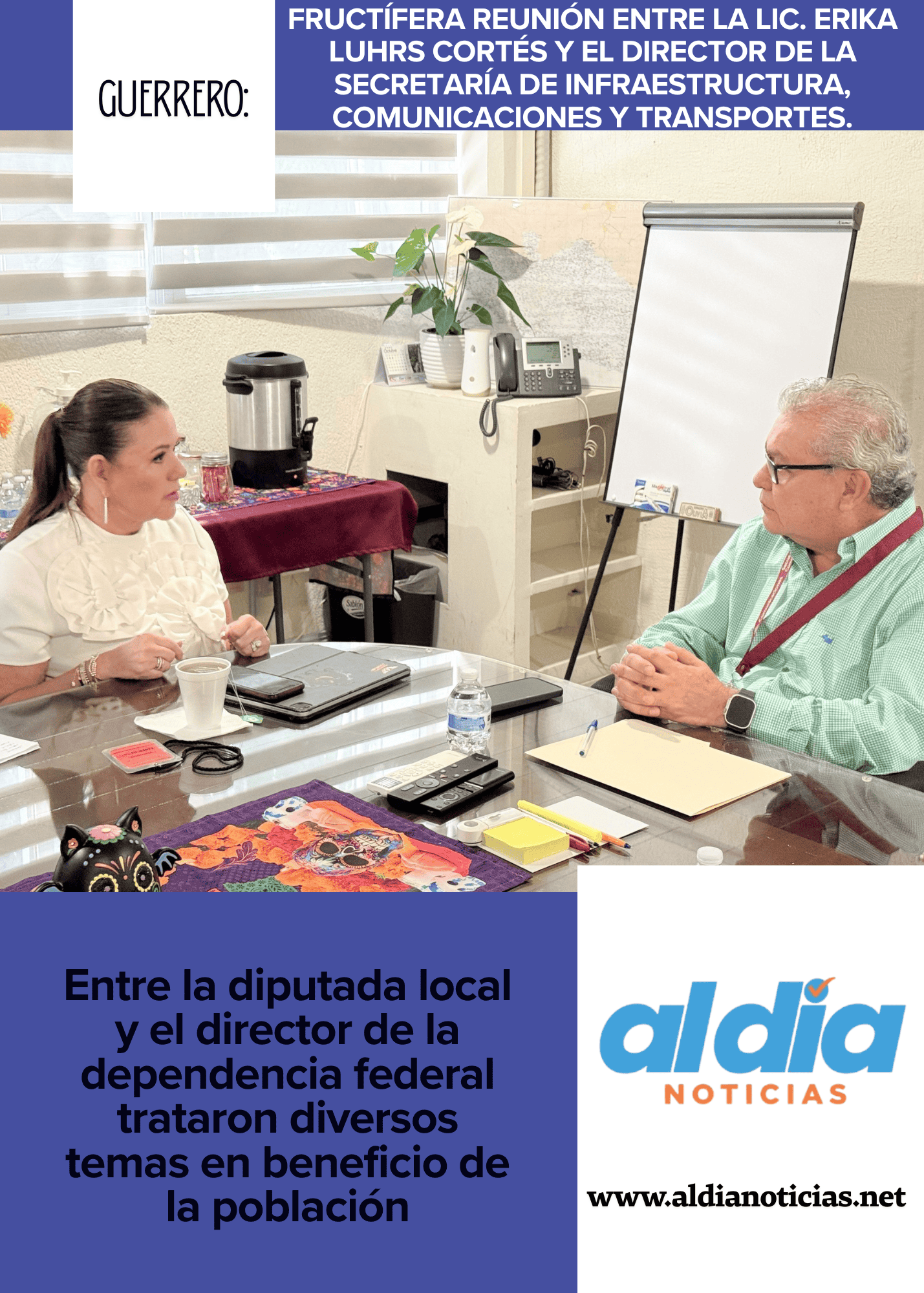 Con el propósito de darle seguimiento a lo que conlleva los avances en cuanto a la infraestructura, obras y caminos, la Licenciada Erika Luhrs Cortés tuvo una amena y fructífera reunión con el Ing. Ricardo Alarcón Abarca quien funge como director de la Secretaría de Infraestructura, Comunicaciones y Transportes.
