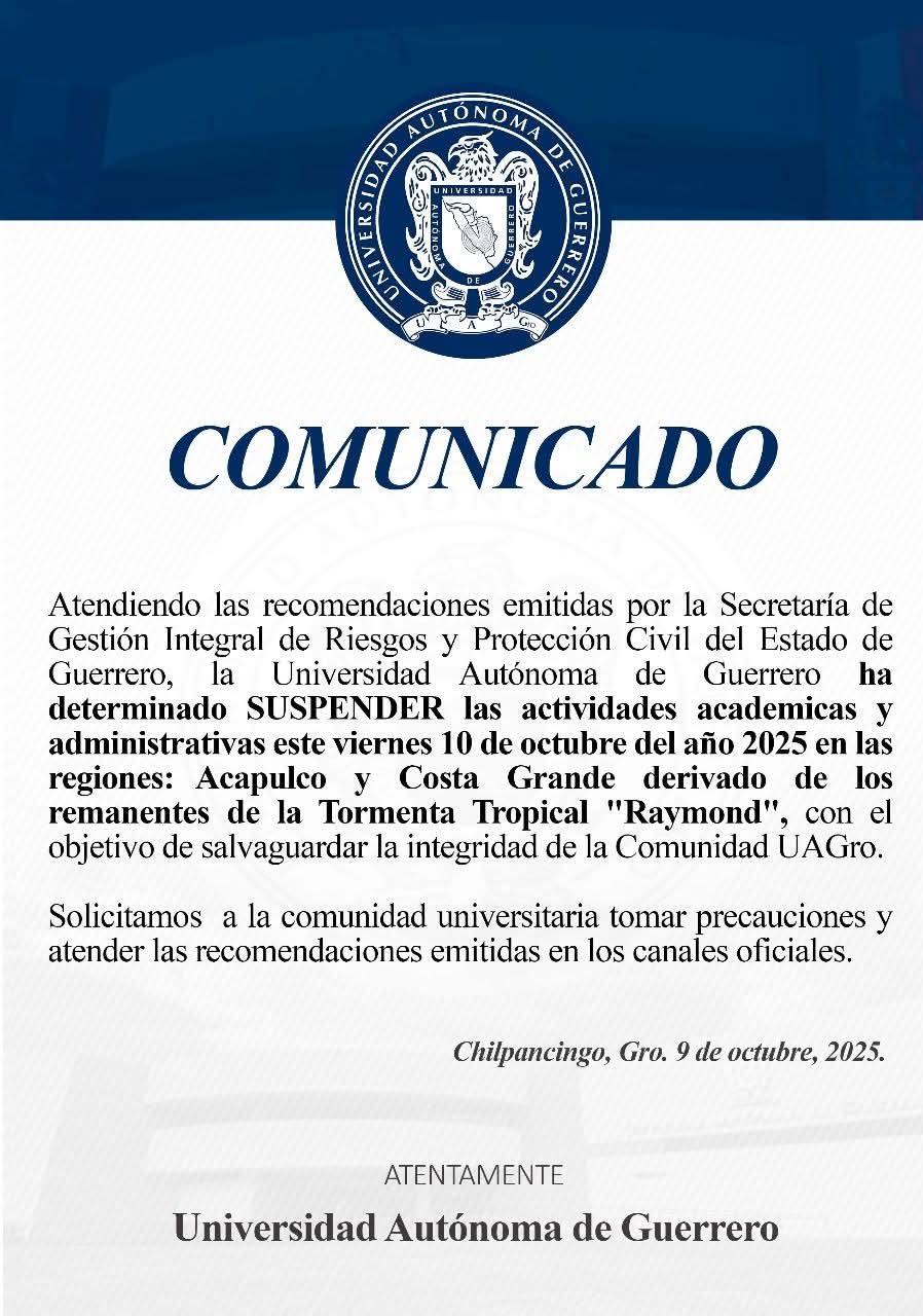Derivado al mal clima ocasionadas por la tormenta tropical «Raymond», la UAGro no haya clases en Acapulco y Costa Grande.