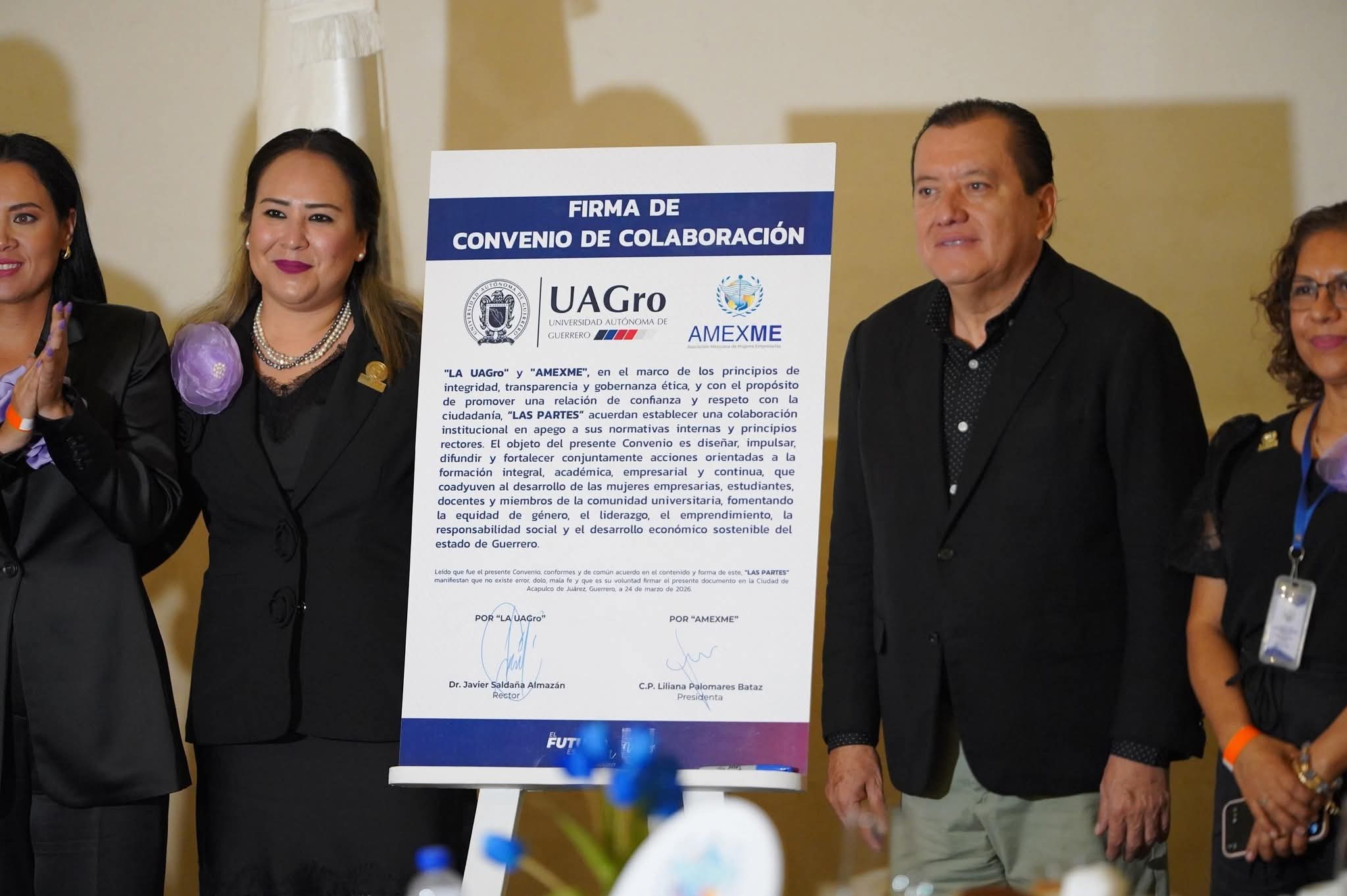 El rector de la Universidad Autónoma de Guerrero, Javier Saldaña Almazán, firmó un convenio de colaboración con la Asociación Mexicana de Mujeres Empresarias (AMEXME), Capítulo Guerrero, con el objetivo de fortalecer el desarrollo profesional y el emprendimiento de las mujeres universitarias.